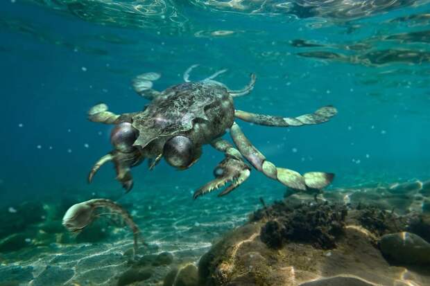 И крабы не остаются от этого в стороне. От креветок, раков и даже крабоидов эту самобытную группу ракообразных отличают широкий щит панциря (карапакс) и редуцированное подогнутое брюшко. Современные крабы совсем не выглядят «грозой морей»: они ползают по дну (главным образом боком), довольствуясь там падалью, и хищничают по мелочи.